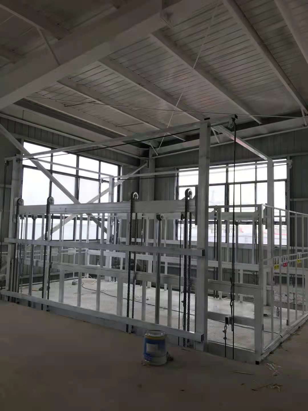 液壓升降貨梯的顏色常見的是工業(yè)灰、天藍、橘紅、黃色這幾種顏色,其中用的最多的是工業(yè)灰和天藍色,但是這次劉總要求我們設備的顏色必須是白色,沒想到白色的安裝完畢還挺漂亮的。