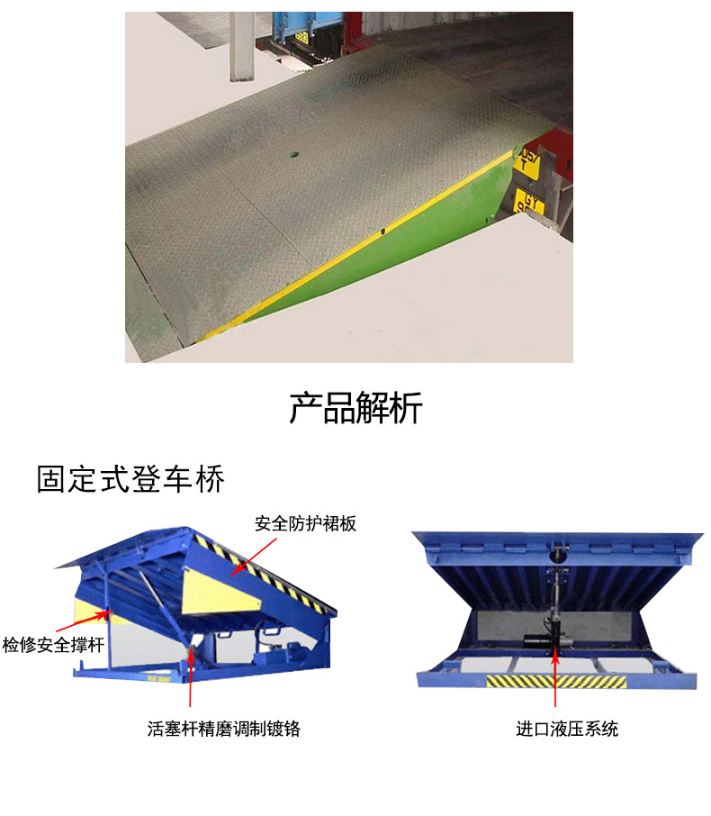 固定式登車橋被廣泛應用到大型的物流園、倉庫、碼頭、郵政運輸、工廠等各種事業(yè)單位的裝卸作業(yè)。