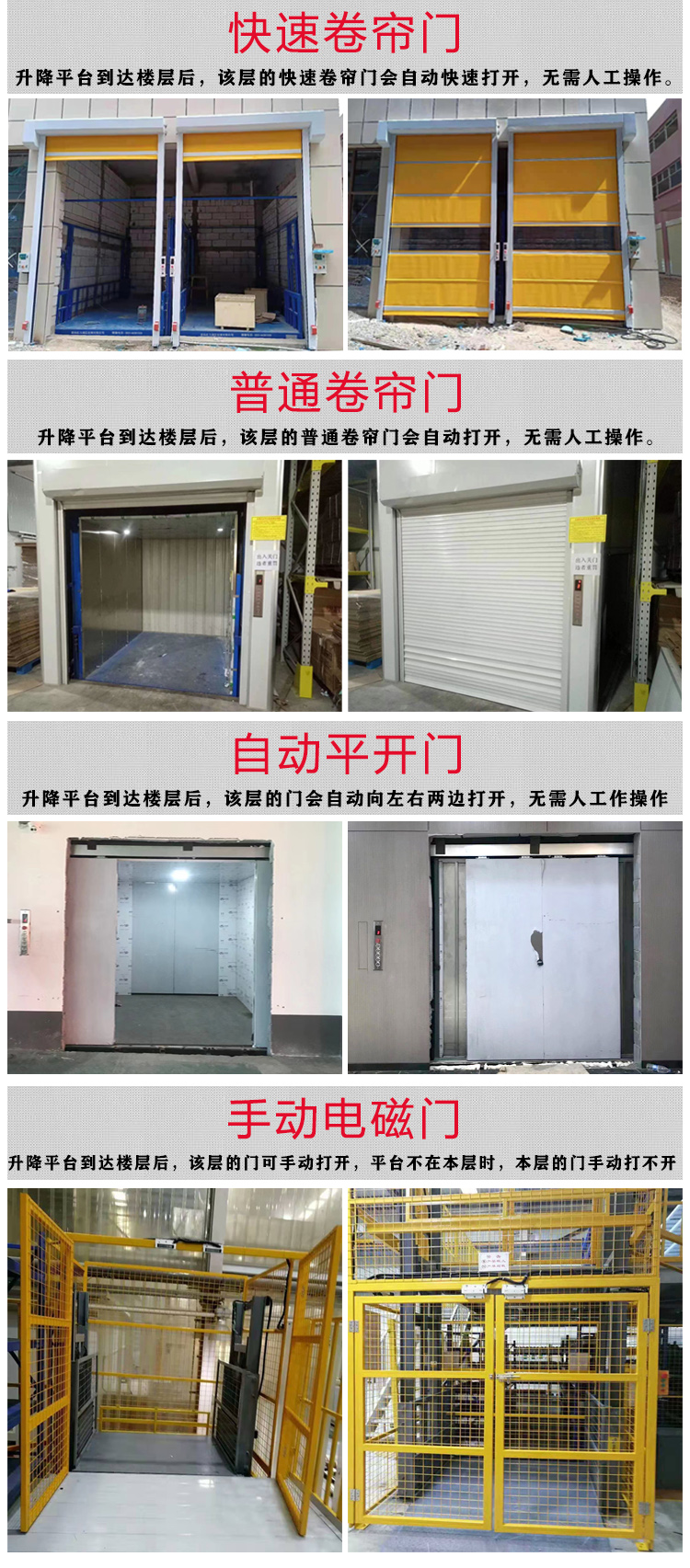 液壓升降貨梯設(shè)定防墜、上下層門互動(dòng),各樓層都安裝數(shù)字顯示操作按鍵。層門可全線貫通,工業(yè)廠房?jī)?nèi)外可互相戳開(kāi),便捷、節(jié)約室內(nèi)空間,層門的選擇有多樣性。根據(jù)客戶的預(yù)算和實(shí)用需求選擇適合的層門即可。