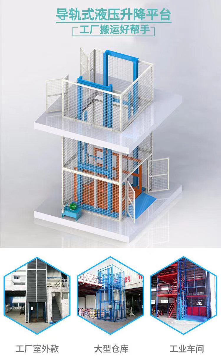 工廠液壓升降貨梯是一種用于工廠物料、成品等貨物的液壓升降機平臺,平臺采用液壓油缸做動力,通過重型鏈條和防墜鋼絲繩傳動,確保平臺運行安全,因此也被稱作導(dǎo)軌式升降作業(yè)平臺,此款設(shè)備在2015年開始不再屬于特種設(shè)備,工廠安裝時也無需向當(dāng)?shù)赜嘘P(guān)部門備案驗收。