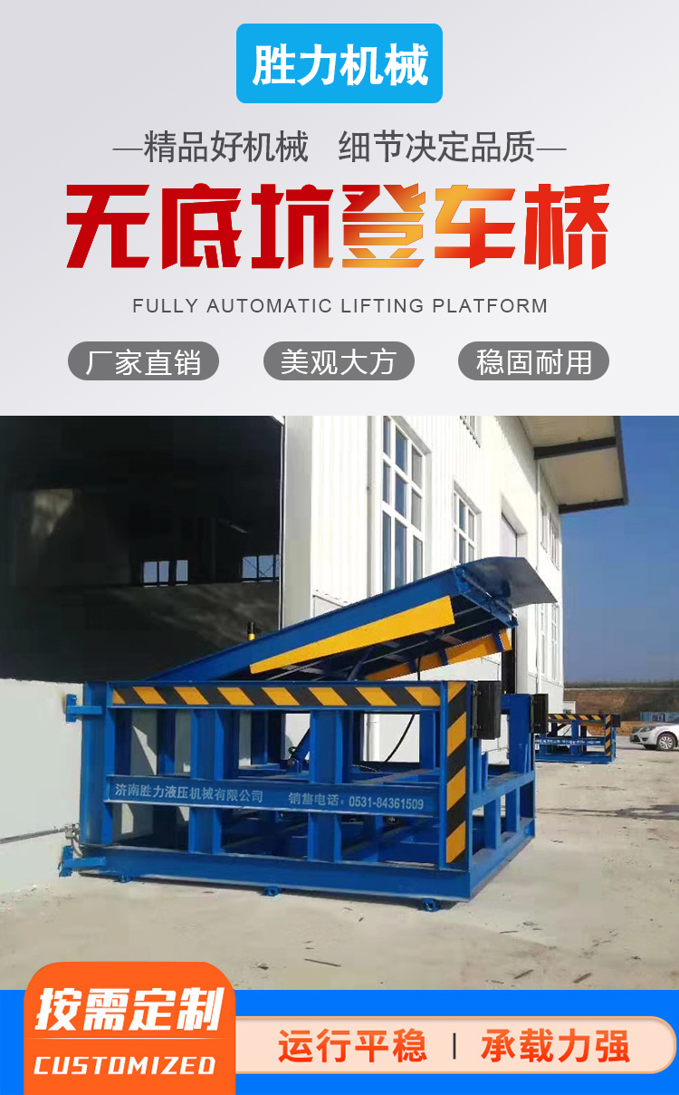 無底坑登車橋是可以不需月臺不需挖坑的裝卸輔助設備,本設備可根據(jù)貨車車廂不同高度調節(jié)即可調高也可調低,它的高度調節(jié)功能使貨車與庫房的貨臺之間架起一座橋梁,方便叉車駛入車廂內部進行貨物的批量裝卸。設備采用進口液壓泵站,兩側設有防軋裙板,工作更加安全,僅需單人作業(yè),即可實現(xiàn)貨物的快速裝卸。固定登車橋可使企業(yè)減少大量勞力,提高工作效率,獲取更大經(jīng)濟效益。無底坑登車橋被廣泛應用在裝卸車頻繁、車型不一的大型企業(yè)、倉庫、車站、碼頭、倉儲物流基地、郵政運輸、物流配送等。